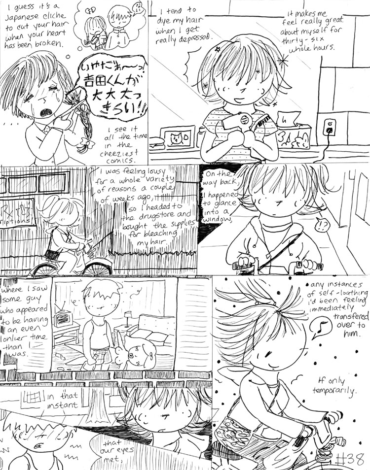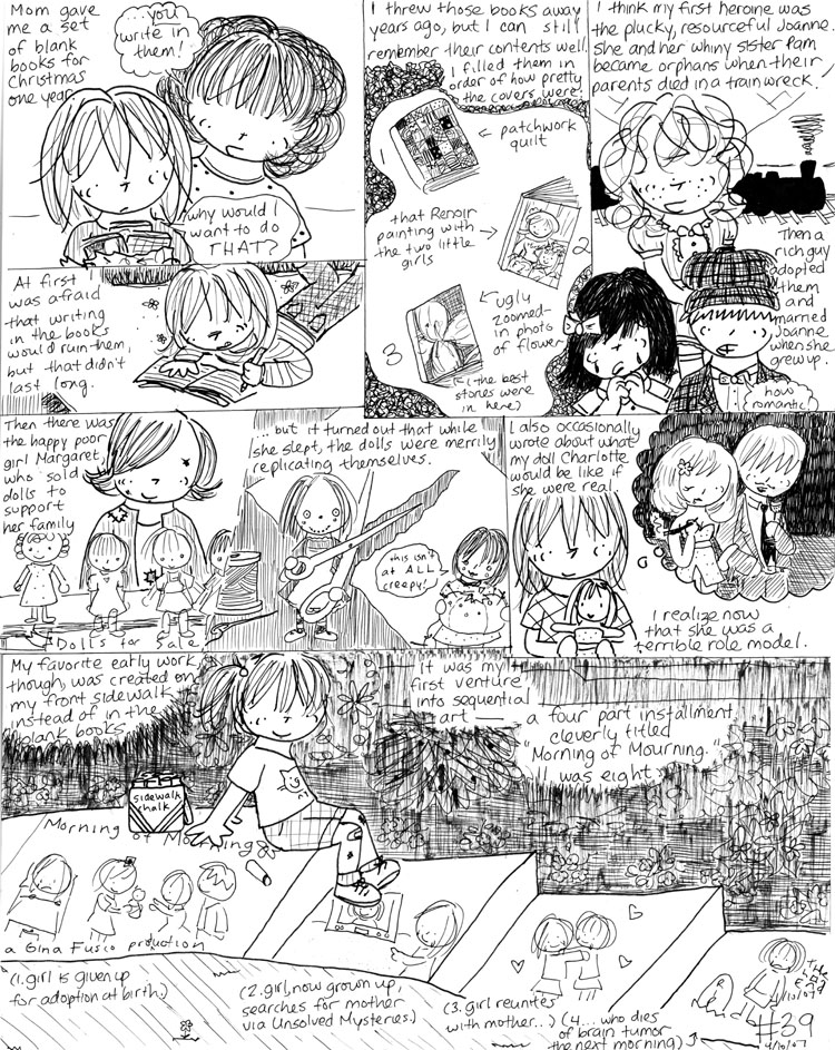 My newer stuff is available in print, while some of the older material is posted down below. If you need even more autobiography, visit the In Print and Minicomics pages.